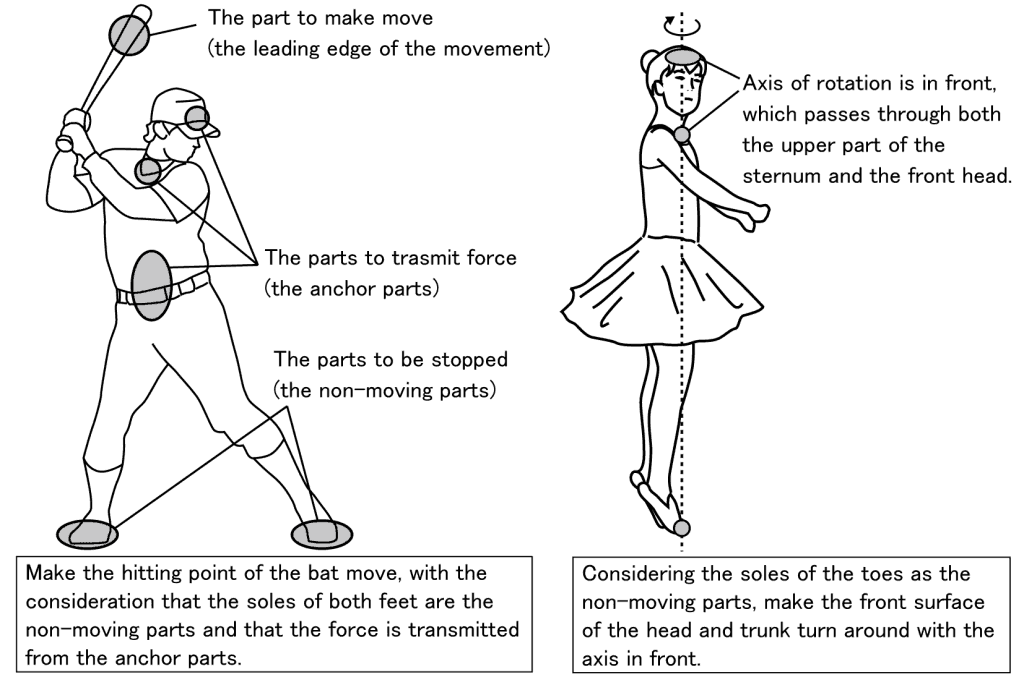 For example, when an executant exerts a certain degree of strong force with an arm, the anchor parts are going to be both the upper part of the sternum and the forehead. The recommended instruction for the executant to practice the action is as follows: “Place the head in the highest position, and turn the forehead moderately forward. With the consideration of transmitting force from both the upper part of the sternum and the forehead, make the leading edge of the arm move.” This instruction is given on the basis of the Bone weight control and the Place-weight base anchoring. The points for an executant to be conscious of when hitting a ball in baseball, and when making a turn in dance are shown in Figure 9. Similarly, we will be able to have instructions like these for many other varying activities.