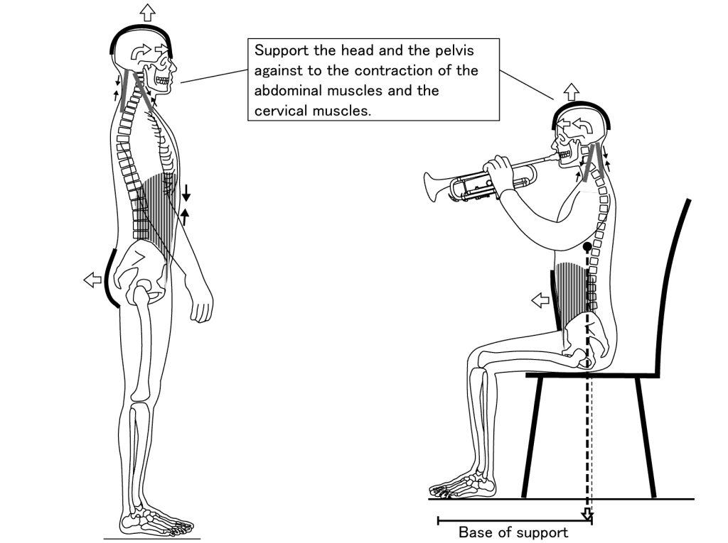 At the time of movement, while we move a part of the body by the contraction of muscles, our axial skeleton simultaneously is going to receive traction forces to be moved by the muscles’ contraction. Furthermore, our axial skeleton is going to receive other forces to be moved through receiving reaction forces of the body action. Thus, it is necessary for an executant to support the axial skeleton and stabilize it for maintaining body position at the time of movement. It becomes an action of stabilizing the body when an executant makes the muscular tension of the abdominal muscles and the cervical muscles excess.